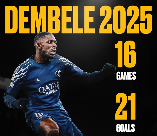 進入2025年之后,登貝萊16場比賽打入21球,這項數(shù)據(jù)是五大聯(lián)賽球員里第一名。