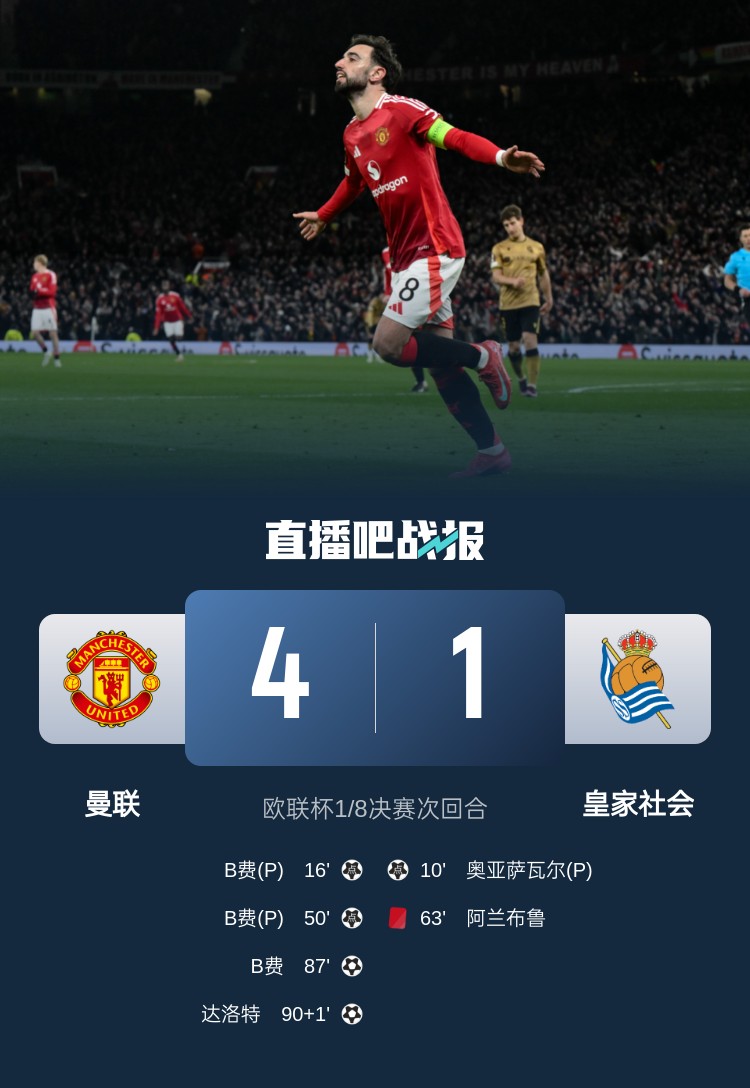 曼聯(lián)歐聯(lián)杯16強(qiáng)次回合4-1擊敗皇社,總比分曼聯(lián)5-2晉級!B費(fèi)完成帽子戲法。