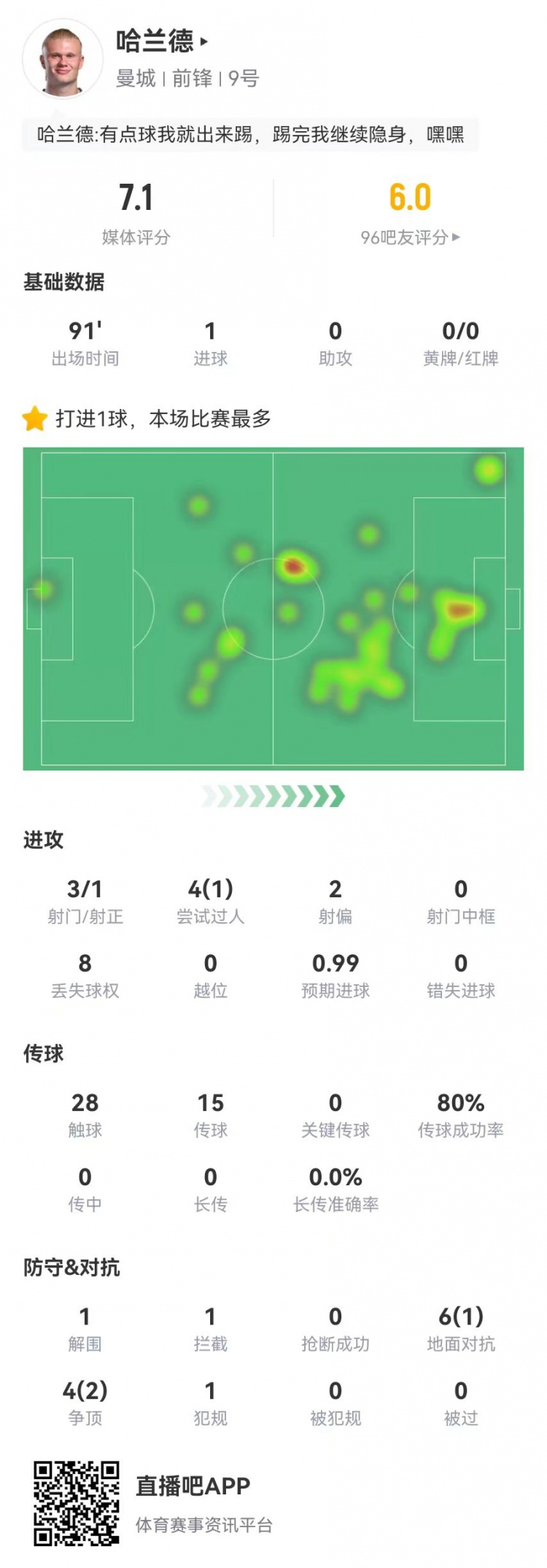 發(fā)布時間:2025年03月16日 01:50點擊:欄目:足球新聞 3月16日訊 曼城在本輪英超2-2戰(zhàn)平布萊頓,哈蘭德本場數(shù)據(jù)如下:首發(fā)踢滿全場1球預(yù)期進(jìn)球0.993射門、1射正4過人、1成功28觸球15傳球、12成功,成功率80%10對抗、3成功8丟失球權(quán)1犯規(guī)1解圍1攔截獲評7.1分 除特別注明外,本站所有內(nèi)容均為九球直播整理排版,轉(zhuǎn)載請注明出處:哈蘭德本場3射1正進(jìn)1球 4過人1成功 10對抗3成功 獲評7.1分 本文標(biāo)簽: 足球 英超 曼城 布萊頓 哈蘭德