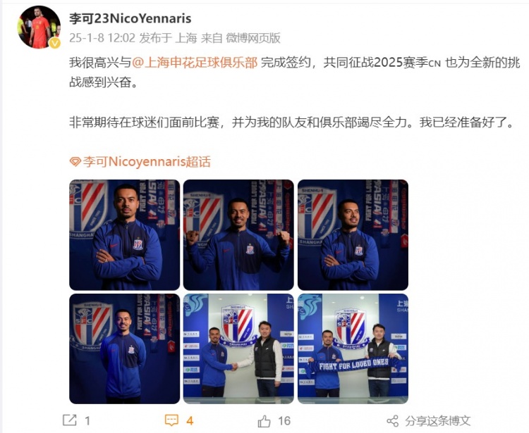 1月8日訊 今天上午,上海申花俱樂部官方宣布與李可簽約。隨后,李可在個人微博中談到了自己的感受。