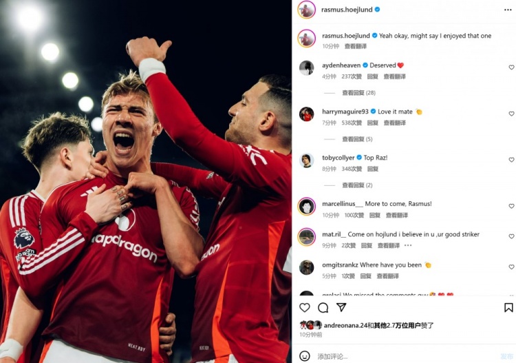 本場進(jìn)球的霍伊倫也終結(jié)了自己連續(xù)21場進(jìn)球荒,賽后他在社媒曬出與隊(duì)友慶祝進(jìn)球的合影,配文寫道:“好吧,我承認(rèn)喜歡這種感覺。”