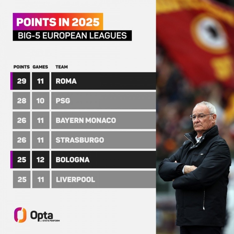 3月18日訊 國家隊(duì)比賽周來襲,五大聯(lián)賽暫時告一段落,OPTA也統(tǒng)計(jì)了2025年五大聯(lián)賽拿分情況,羅馬居首。