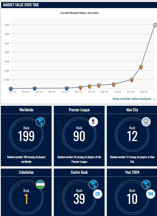 03月18日訊 德轉(zhuǎn)更新了最新英超身價(jià),曼城中衛(wèi)胡桑諾夫身價(jià)達(dá)3500萬(wàn)歐。