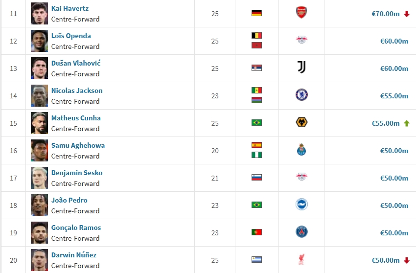 11. 哈弗茨,阿森納:7000萬歐元(下跌500萬)