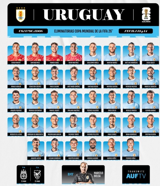 3月19日訊 為了迎接即將到來的對陣阿根廷和玻利維亞的比賽,烏拉圭國家隊(duì)公布了新一期的大名單,努涅斯、烏加特、本坦庫爾、巴爾韋德入選。