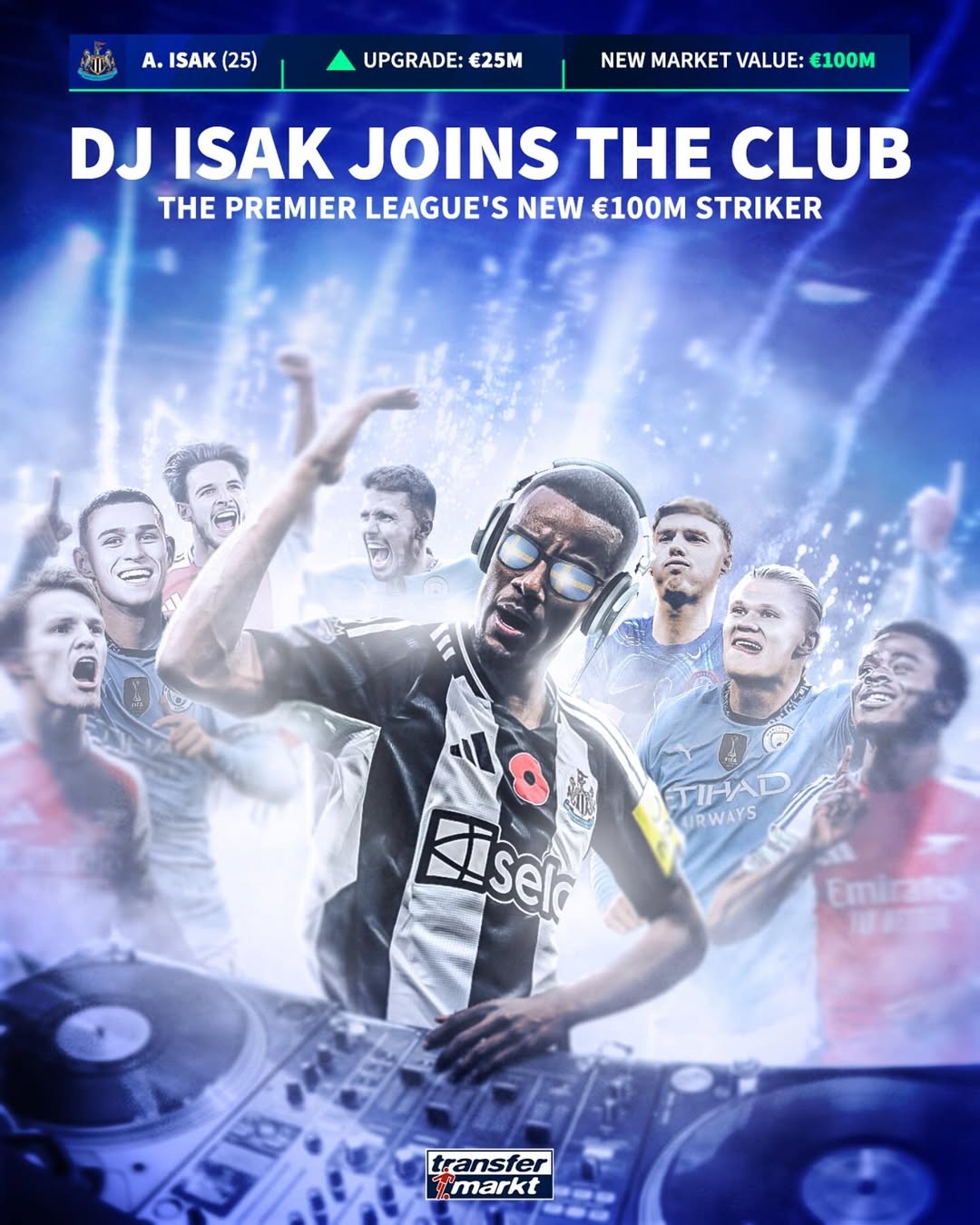 03月19日訊 德國(guó)足球轉(zhuǎn)會(huì)市場(chǎng)昨日更新英超球員身價(jià),紐卡前鋒伊薩克身價(jià)暴漲2500萬(wàn)歐元,從7500萬(wàn)歐漲至1億歐,成為新晉億元先生。