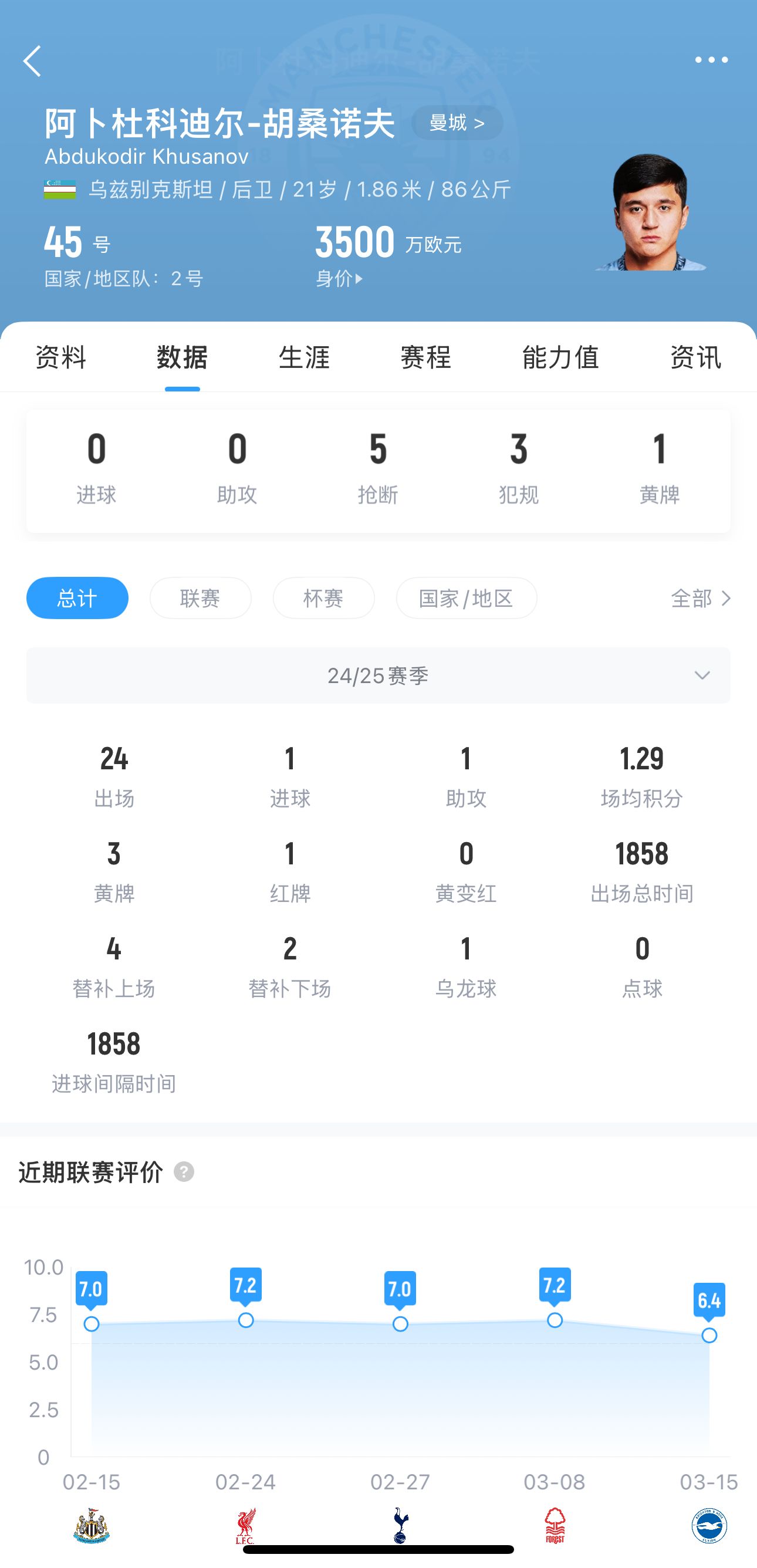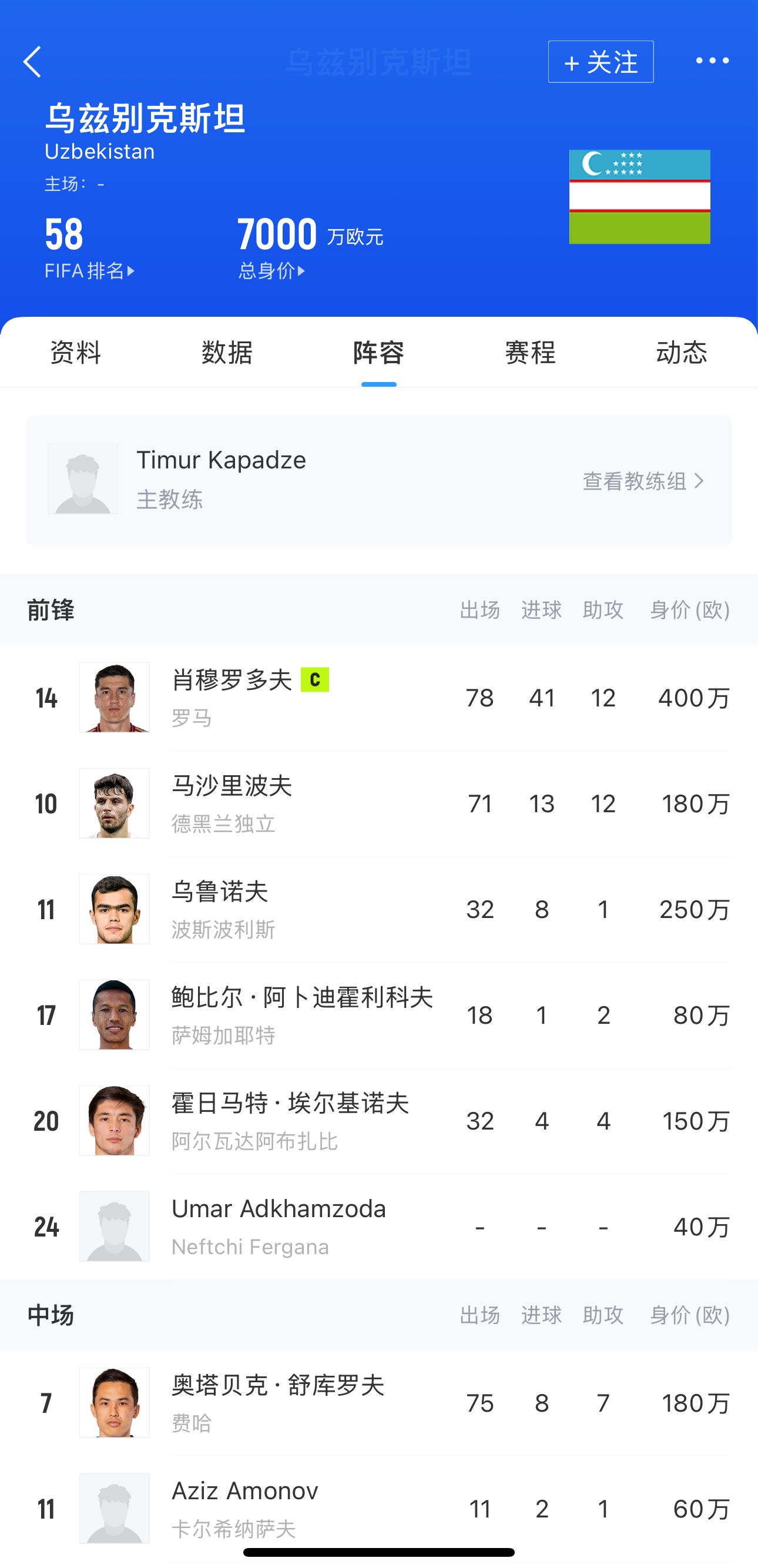 21歲小胡當(dāng)大腿烏茲別克全隊身價7000萬歐,胡桑諾夫占一半