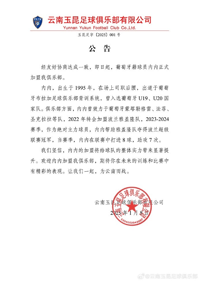 我們堅(jiān)信,內(nèi)內(nèi)的加盟將給球隊(duì)的整體實(shí)力帶來顯著提升。歡迎內(nèi)內(nèi)加盟我俱樂部,期待你在未來的訓(xùn)練和比賽中有精彩的表現(xiàn)。讓我們一起為云南而戰(zhàn)。