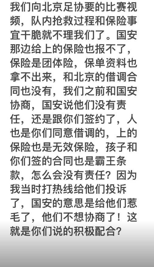 國安那邊給上的保險也報不了,保險是團(tuán)體險,保單資料也拿不出來,和北京的借調(diào)合同也沒有,我們之前和國安協(xié)商,國安說他們沒有責(zé)任,還是跟你們簽約了,人也是你們同意借調(diào)的,上的保險也是無效保險,孩子和我們向北京足協(xié)要的比賽視頻,隊內(nèi)搶救過程和保險事宜干脆就不理我們了。國安那邊給上的保險也報不了,保險是團(tuán)體險,保單資料也拿不出來,和北京的借調(diào)合同也沒有,我們之前和國安協(xié)商,國安說他們沒有責(zé)任,還是跟你們簽約了,人也是你們同意借調(diào)的,上的保險也是無效保險,孩子和你們簽的合同也是霸王條款,怎么會沒有責(zé)任?因為我當(dāng)時打熱線給他們投訴了,國安的意思是給他們?nèi)敲耍麄儾幌雲(yún)f(xié)商了!這就是你們說的積極配合?