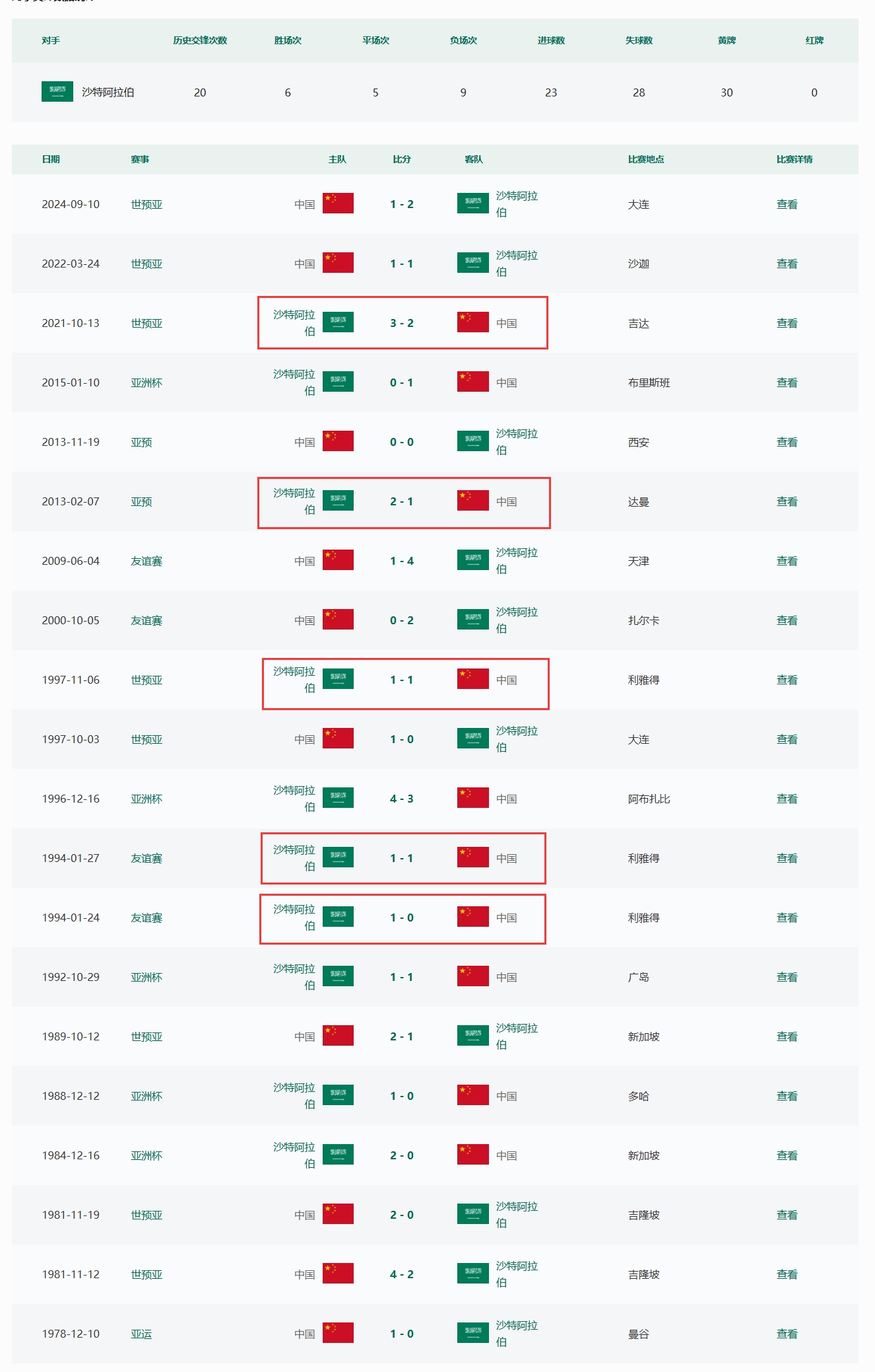 歷史交手?jǐn)?shù)據(jù)顯示,國足共20次交手沙特,取得6勝5平9負(fù)的戰(zhàn)績。