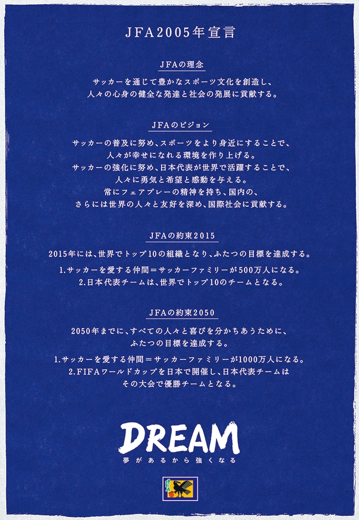 長(zhǎng)期:到2050年,日本在本土舉辦世界杯,并奪得冠軍,熱愛(ài)足球的人口達(dá)到1000萬(wàn)。