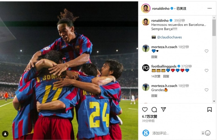 羅納爾迪尼奧社媒曬出巴薩時(shí)期與隊(duì)友一起慶祝的照片,配文:“在巴薩的美好回憶,巴薩永恒!”