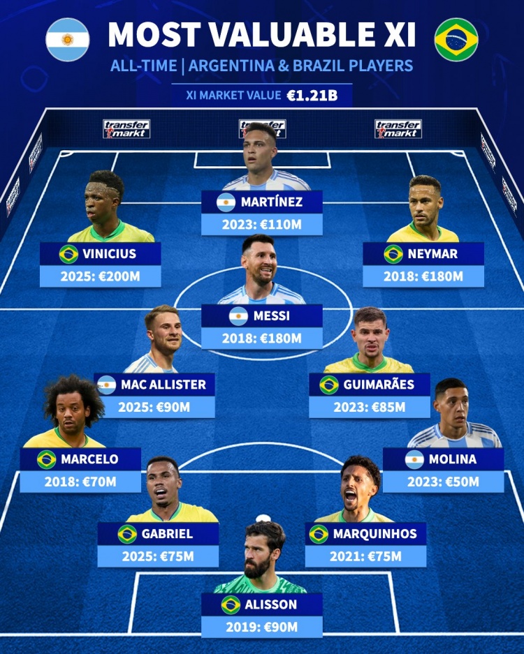 巴西+阿根廷德轉(zhuǎn)歷史最高身價陣容(總價12.1億歐)