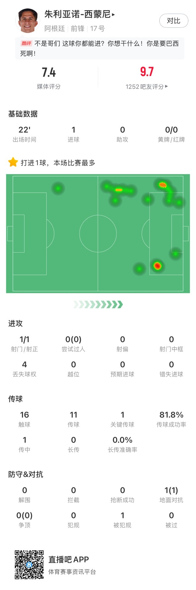 出場(chǎng)時(shí)間22分鐘,進(jìn)球1個(gè)