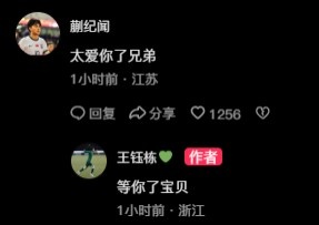 他在U20國(guó)足的隊(duì)友蒯紀(jì)聞留言“太愛(ài)你了兄弟”,王鈺棟則調(diào)侃回復(fù)“(國(guó)家隊(duì))等你了寶貝”。