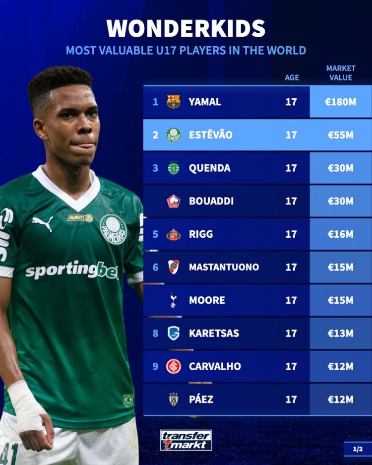 除特別注明外,本站所有內(nèi)容均為九球直播整理排版,轉(zhuǎn)載請注明出處:德轉(zhuǎn)U17身價榜:亞馬爾1.8億斷崖領(lǐng)跑,切爾西預(yù)訂埃斯特旺等多人