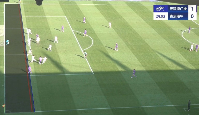 比賽第23分鐘,巴頓禁區(qū)內(nèi)抽射破門(mén),隨后VAR介入,判罰阿代米在接應(yīng)王秋明傳球時(shí)越位在先,進(jìn)球無(wú)效。場(chǎng)上比分仍為津門(mén)虎1-0海牛。
