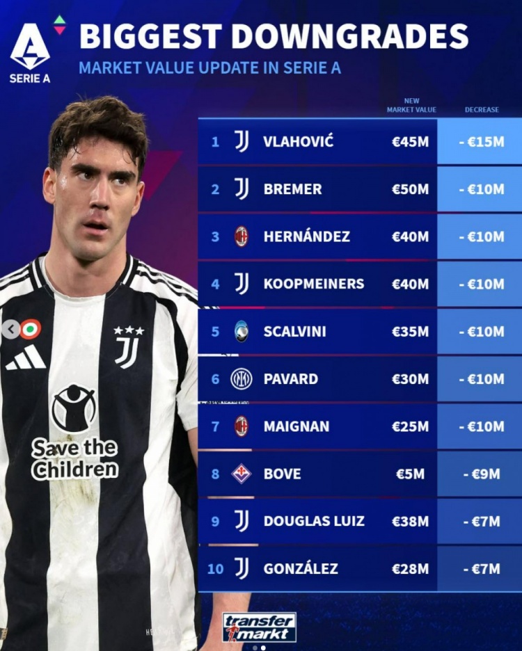 3月30日訊 德轉(zhuǎn)此前更新了意甲球員身價,并盤點(diǎn)了此次更新身價下跌最多的前十榜單,其中弗拉霍維奇居首,尤文球員在前十中占據(jù)5席,具體球員目前身價以及跌幅如下: