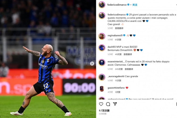 迪馬爾科也在賽后通過(guò)社媒曬出了自己的慶祝照并配文:“過(guò)去29天我都在想著這樣的時(shí)刻,只想著我如何才能夠幫助到隊(duì)友。保持冷靜,繼續(xù)前進(jìn)