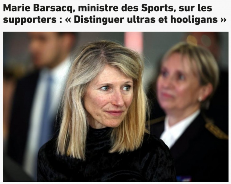 4月1日訊 法國(guó)體育部長(zhǎng)瑪麗-巴薩克接受采訪,談及球迷問(wèn)題?,旣?巴薩克闡述了她計(jì)劃如何與內(nèi)政部長(zhǎng)及俱樂(lè)部展開協(xié)作,以整治球迷群體亂象。