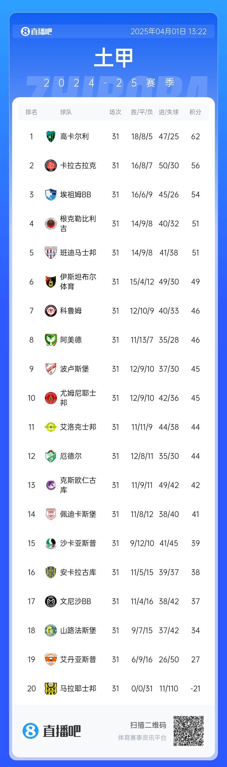 除特別注明外,本站所有內(nèi)容均為九球直播整理排版,轉(zhuǎn)載請注明出處:31輪0勝0平31負積分-21土甲墊底隊進11球丟110球,仍在奮戰(zhàn)中
