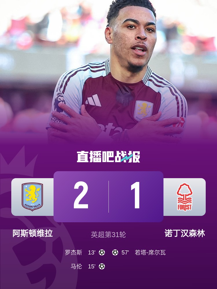 04月06日訊 英超第31輪維拉2-1擊敗森林,近期三線高歌猛進:足總杯進4強、聯(lián)賽3連勝升第6,、歐冠闖入8強。