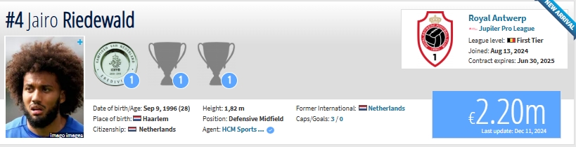 里德瓦爾德現(xiàn)年28歲,司職中場也可以踢后衛(wèi),曾效力于英超水晶宮,現(xiàn)效力于安特衛(wèi)普,德轉(zhuǎn)身價220萬歐。