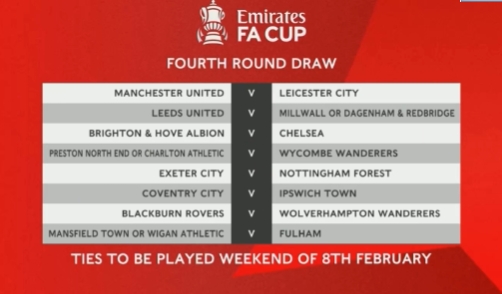 1月13日訊 足總杯第四輪抽簽結果出爐,將有四場英超內戰(zhàn),利物浦和曼城抽到好簽。切爾西將客戰(zhàn)布萊頓,維拉將對陣熱刺,曼聯主場迎戰(zhàn)萊斯特城,埃弗頓主場對陣伯恩茅斯,
